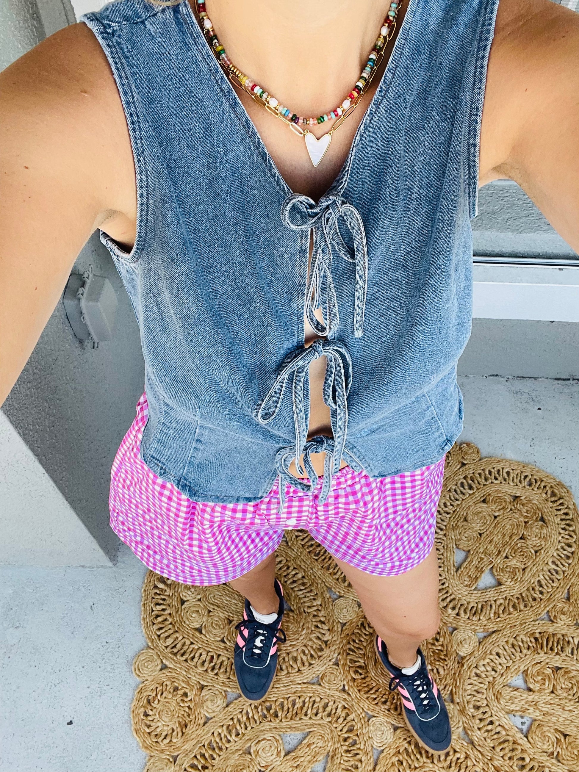 Welcoming the top of the Spring + Summer! Our ' Beverly Bow Denim Top' is both preppy and sexy! Denim material top features 3 bows to create the front tie look. Faux boning stitching creates extra flattering look.