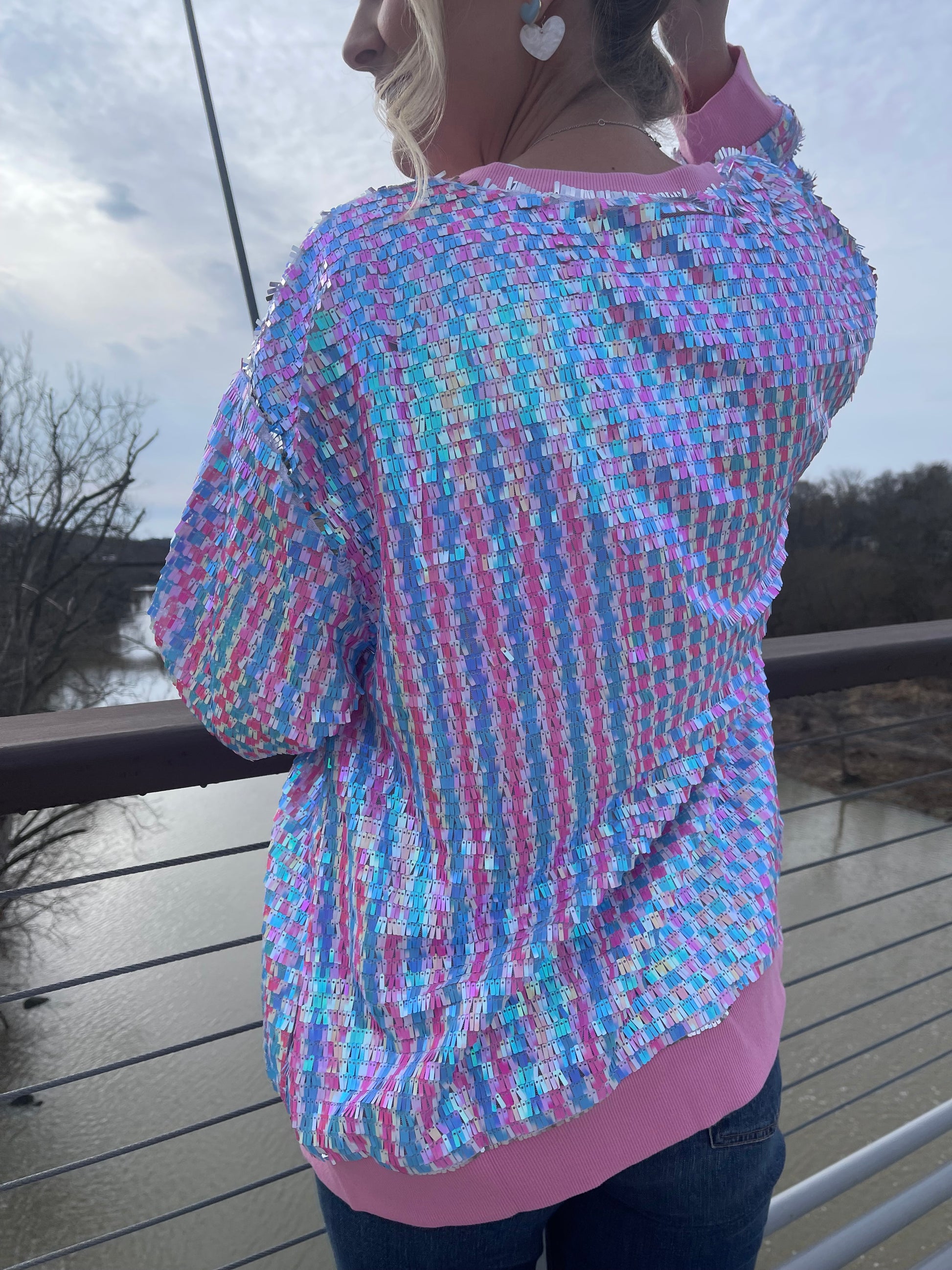 Fashion should be fun and this two-toned sequin bomber jacket is sure to accomplish just that! A light pink and blue combo makes for a fun piece all season long! While the outside is sure to shine, you'll be comfortable all day and night with soft interior lining.
