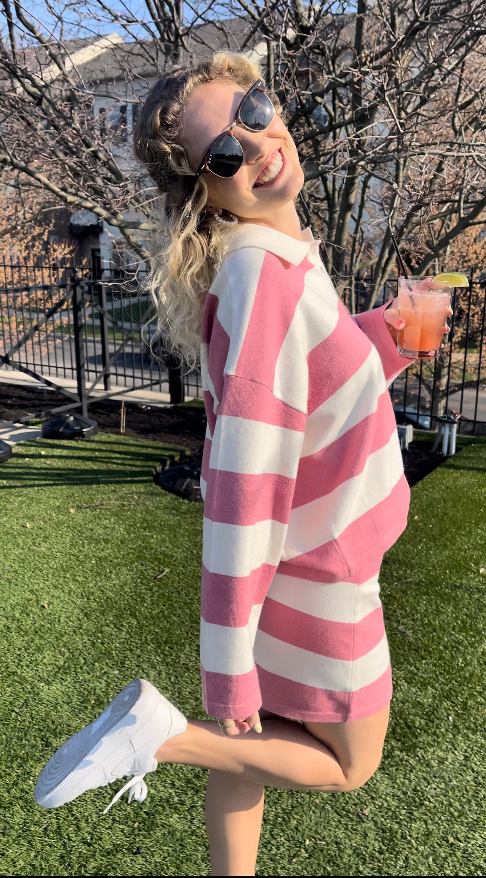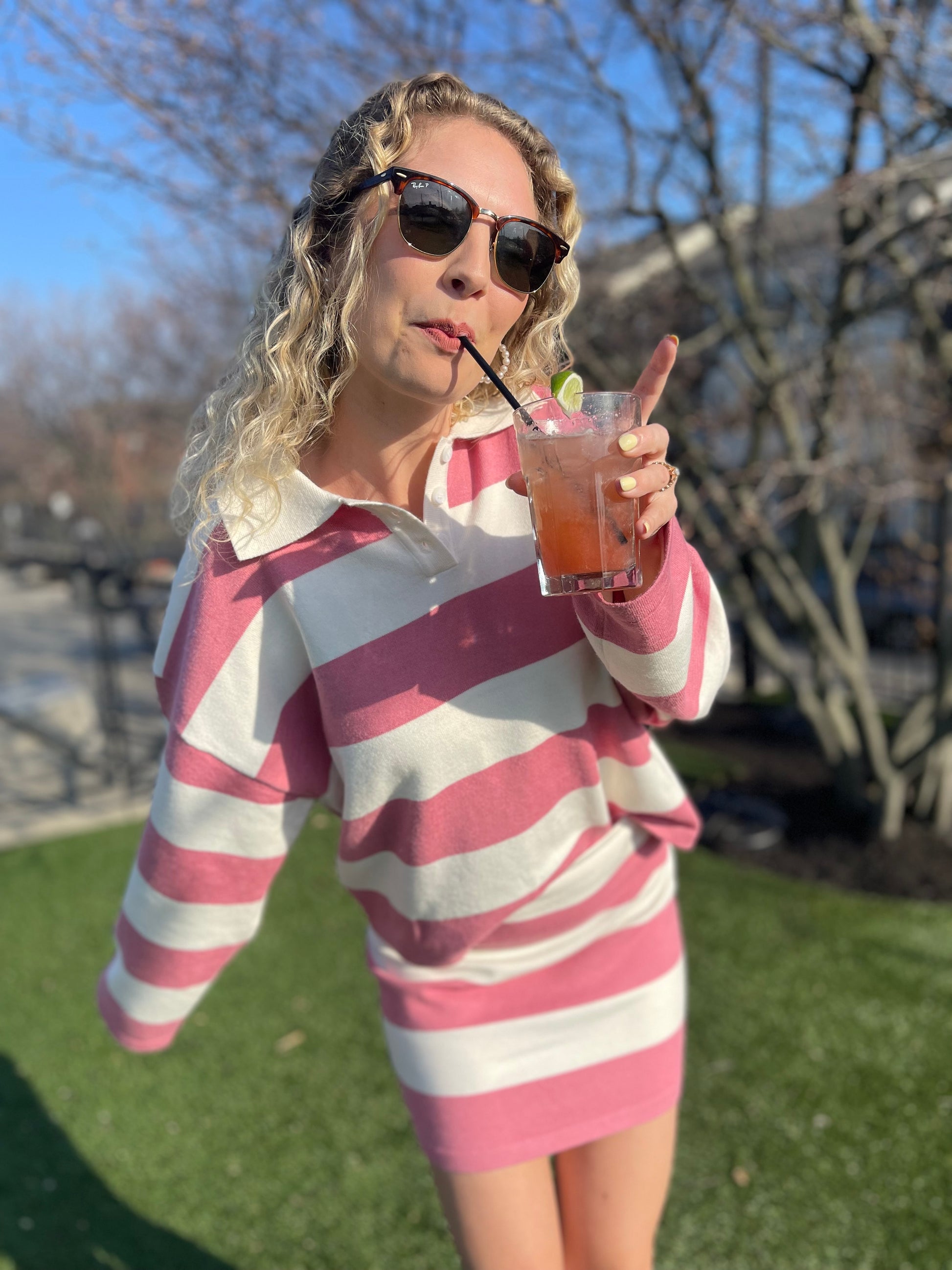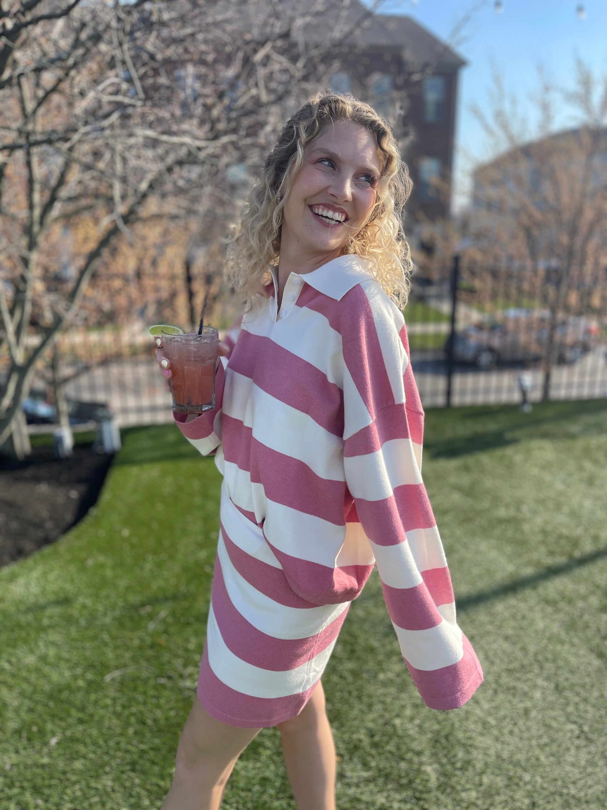 This pink and white stripped two piece set is our personal favorite! A collared top and complementing skirt are perfect for any occasion! Oversized top and slight form fitted skirt.