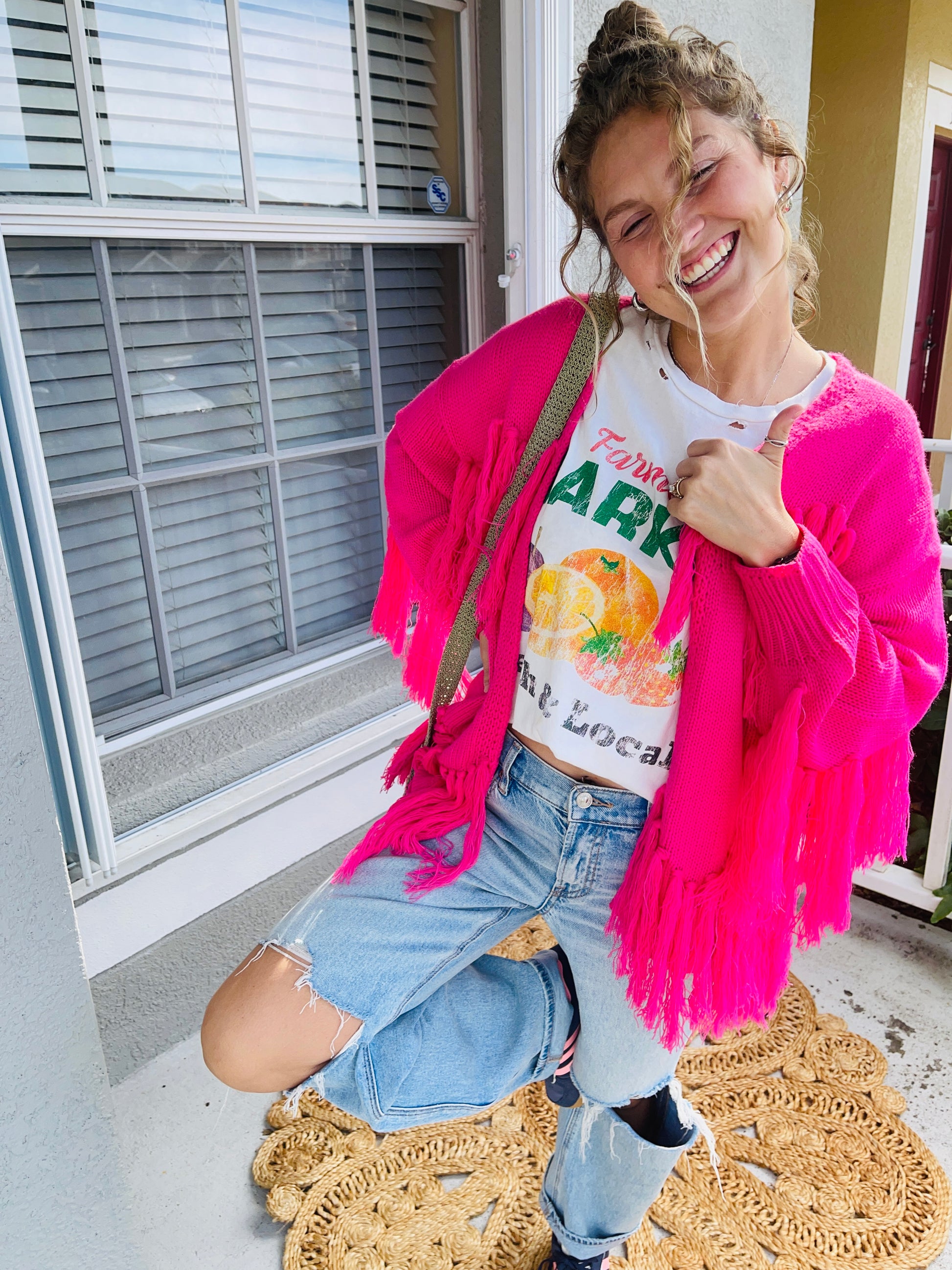 Fringe & Fuchsia... does it get any better? This lightweight cardigan has fringe throughout & is the perfect lightweight layer! The bright color is an added bonus & is sure to brighten everyone's day. Very soft. Order true to size, but has natural oversized fit. Size down if between sizes.