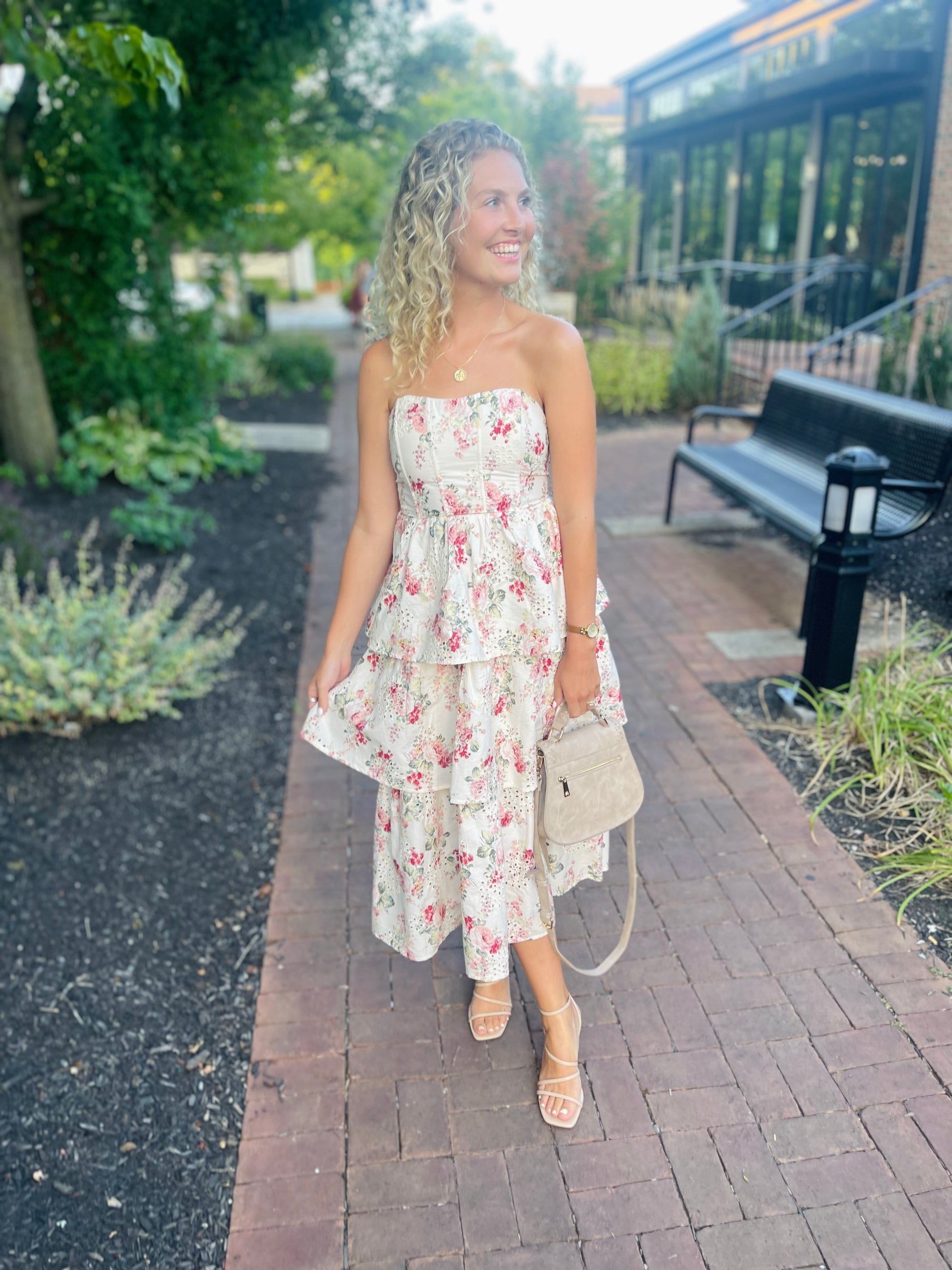 Date Night? Spring Gala? Our stunning 3 tiered 'Lily Foral' dress features a strapless fit, back zip closure, and tiered ruffle silhouette. Detailed with a beautiful floral eyelet fabric and bust boning, this piece is made for any special occasion.