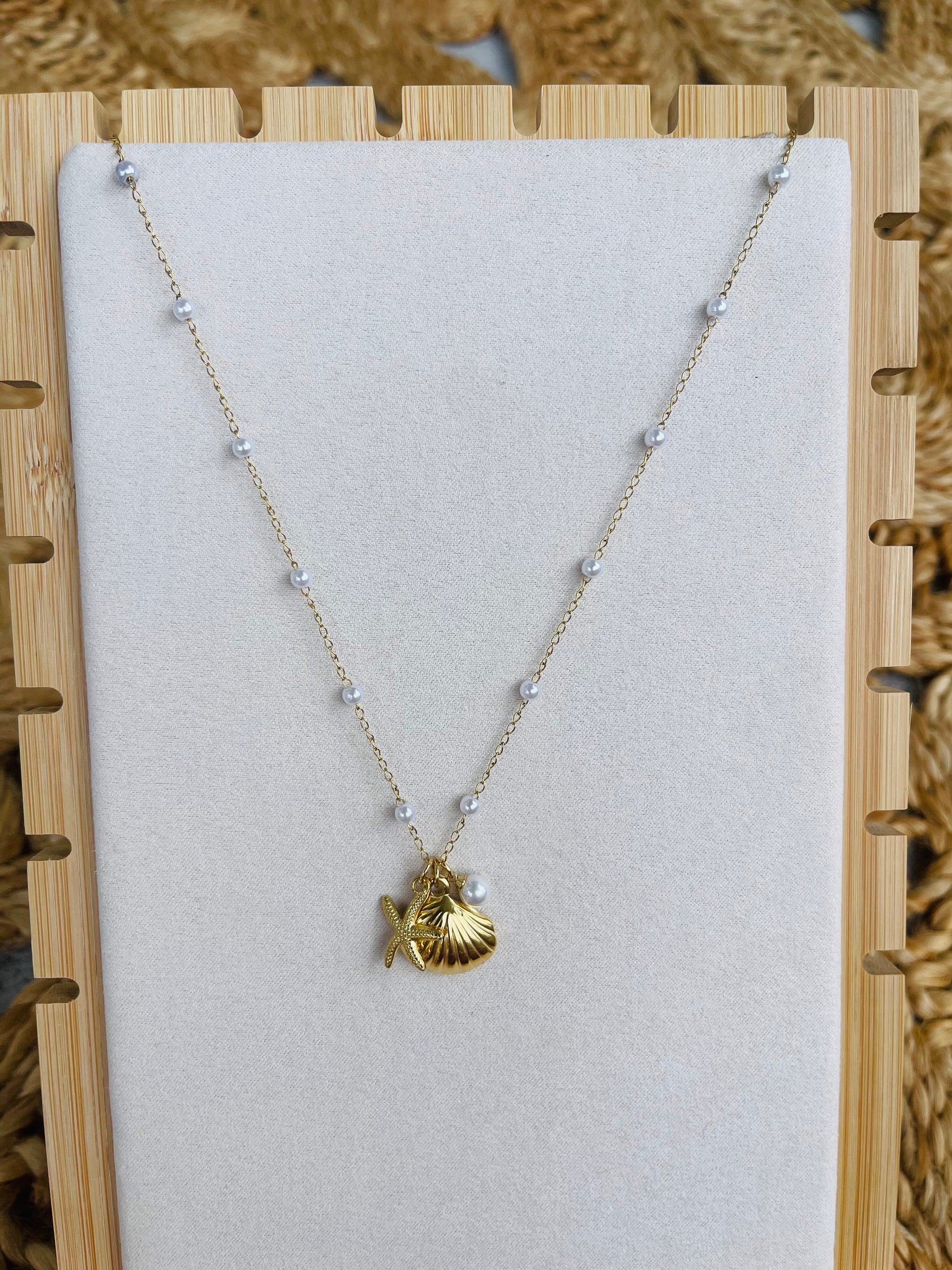 18k Gold seashell & starfish necklace with pearl accents. Simple and easy layering necklace. Adjustable Clasp.